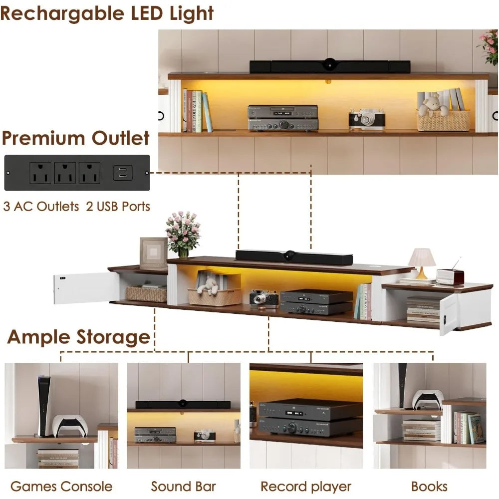 One of the stand’s standout features is the integrated floating shelf with a removable, rechargeable LED light. This practical addition provides ambient lighting that sets the perfect mood for movie nights or casual viewing. You can easily charge the LED light and position it to suit your needs, adding both function and atmosphere to your entertainment setup.