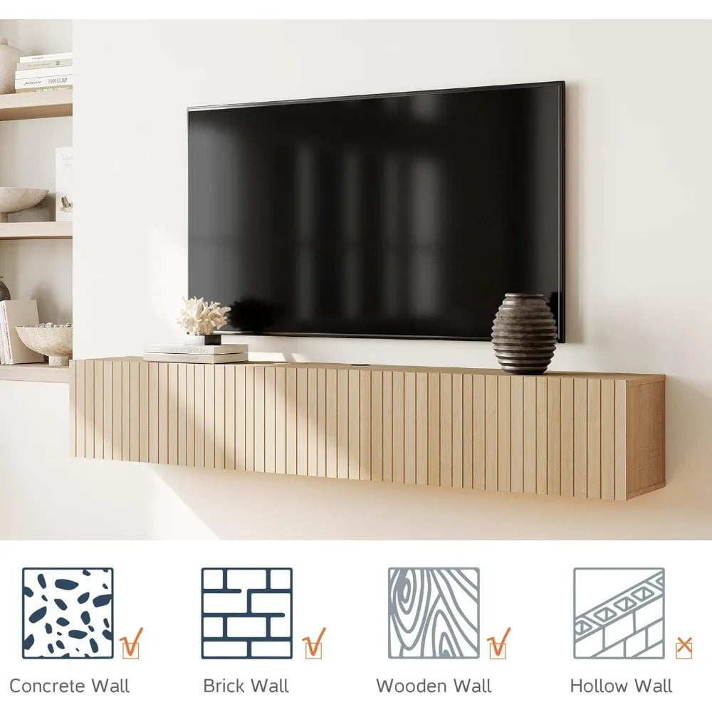 Designed with everyday living in mind, this wall-mounted TV stand saves valuable floor space, making it ideal for apartments, smaller rooms, or anyone looking to create a clean, open environment. The three spacious compartments offer ample storage for a DVD player, gaming accessories, books, or decorative items, helping you reduce clutter and keep essentials within easy reach. Unlike traditional drawers, the flip door design maximizes storage capacity while maintaining a sleek, streamlined look.