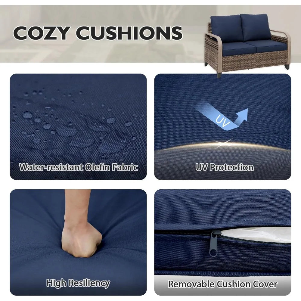 One of the standout features is the hand-woven resin wicker construction. Unlike natural wicker, which can crack or fade when exposed to the elements, this resin wicker is flexible, weather-resistant, and built to last season after season. The wicker is carefully woven over a powder-coated alloy steel frame, providing a sturdy foundation that supports up to 500 pounds with confidence. This means your new loveseat is made for everyday outdoor use, whether it's relaxing with a friend or hosting a casual conversation spot.