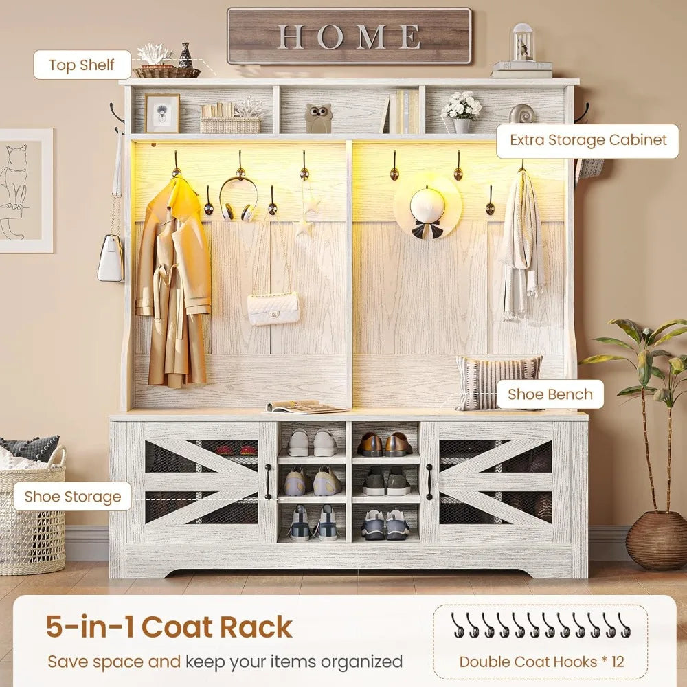 This 5-in-1 hall tree combines multiple storage solutions into one smart design, helping you make the most of your entryway, hallway, or any space that needs a tidy upgrade. With an embossed white finish and a farmhouse style, it fits seamlessly into both traditional and modern interiors, offering a fresh, clean look.