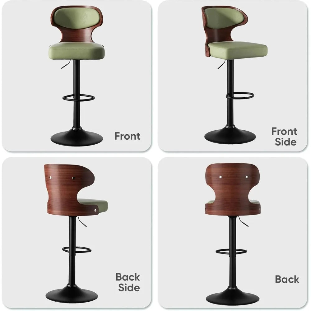 Meet the Bar Stools Set of 2: all the style, comfort, and durability you want, at a price that makes sense. These bentwood swivel bar stools offer a smart and versatile seating solution for your kitchen island, home bar, dining area, or even a cozy coffee shop corner. Built on a sturdy metal frame, these stools promise long-lasting support and stability. Their firm, wide base prevents wobbling, while an anti-scratch rubber ring on each foot protects your floors and keeps the stools securely in place. Designed to hold up to 550 lbs, they’re reliable options for everyday use by a range of individuals. The seat is upholstered in soft, green faux leather that’s both stylish and easy to clean—perfect for handling spills or daily wear without fuss. Underneath, a foam cushion provides comfortable support, maintaining its shape to keep you sitting comfortably through meals, conversations, or work sessions. The ergonomic backrest reduces fatigue by offering excellent lumbar support, while the curved footrest encourages a relaxed posture, making these stools a practical choice for long sitting periods. One of the smartest features is the adjustable height, ranging from 24.5 to 33.5 inches, allowing you to tailor the seating to your counter or bar height effortlessly. Plus, the 360° swivel function adds mobility and convenience, so you can move around easily without having to stand up. Whether you’re serving breakfast or entertaining guests, this flexibility enhances your experience. These bar stools are designed with versatility in mind. Their modern style and fresh green color blend seamlessly into various settings, from contemporary kitchens to casual dining rooms or trendy cafes. The set of two stools gives you flexible seating options and makes it simple to mix and match with your current décor. Why You’ll Love It: