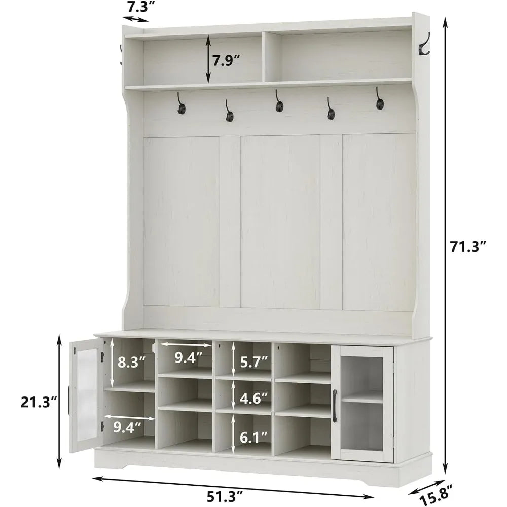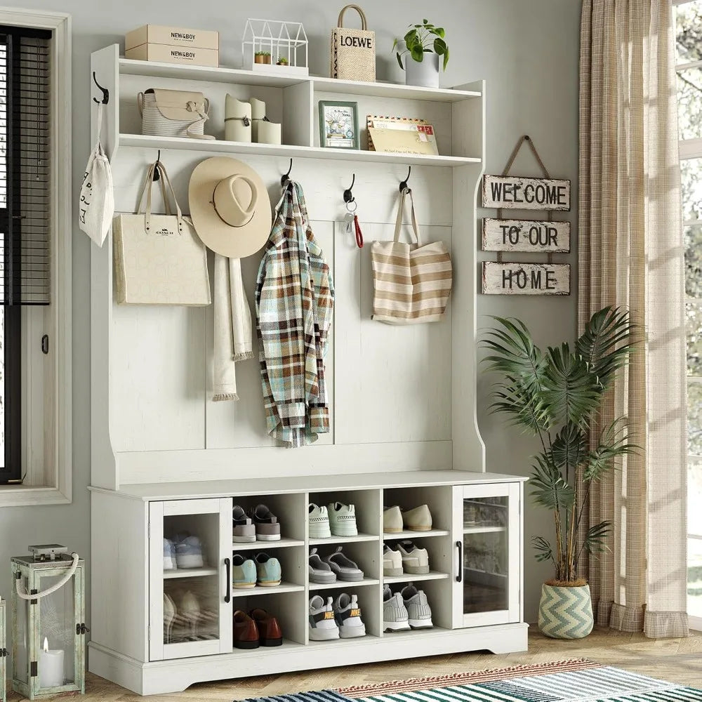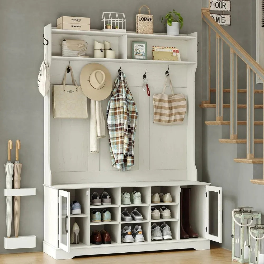 Meet the Off-White Hall Tree with 10 Shoe Storage, 7 Coat Hooks, Adjustable Shelf, and Glass Door Entryway Bench by FurnitureZ: all the style and durability you want, at a price you'll appreciate. This smartly designed piece combines multiple functions into one compact solution, helping you keep your entryway neat, organized, and welcoming without overspending.