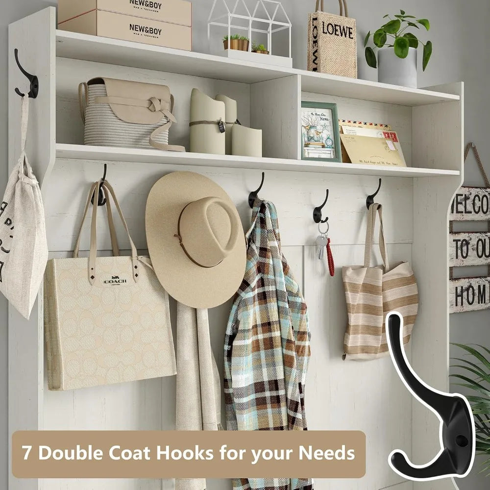 Storage is where this hall tree truly shines. It includes 7 tri-hooks and 7 double hooks that provide ample hanging space for coats, bags, hats, and scarves, keeping your essentials within easy reach. Above, three large compartments offer additional storage options for items you want to keep organized but out of sight.
