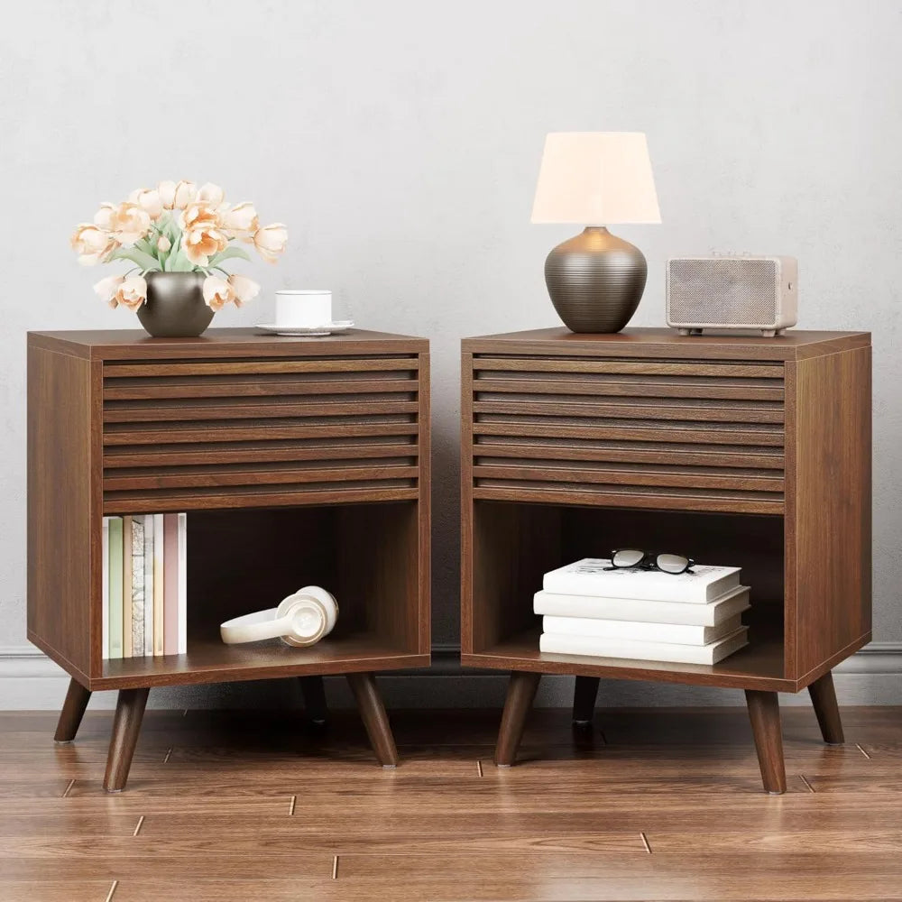 Meet the Pair of Mid-Century Modern Nightstands by FurnitureZ: all the style and durability you want, at a price you'll appreciate. Designed to bring both charm and practical storage to your bedroom or living space, these wooden fluted side tables combine classic mid-century aesthetics with thoughtful functionality. Crafted with a solid wood legs and an engineered wood body, these nightstands offer long-lasting stability and strength. The engineered wood frame and top are not only durable but also crafted with attention to a healthier home environment, as they contain no high-concerned chemicals. This means you get furniture that’s smartly made and safe for your family. Each nightstand measures 16D x 19W x 24H inches, making them a perfect fit even for smaller rooms or apartments where space is at a premium. The design features a spacious drawer with a minimalist slat panel front, ideal for storing bedside essentials out of sight but within easy reach. Below the drawer, an open shelf offers additional space for books, glasses, or your favorite device, keeping your bedside clutter-free and organized. The wide, flat top surface provides plenty of room for a clock, cup, or speaker—whatever you need close at hand to start or end your day. Their versatile mid-century modern look fits seamlessly into a variety of decors, from contemporary bedrooms to cozy living rooms or even offices. These nightstands can easily double as end tables or side tables next to sofas or armchairs, adding style and storage wherever you need it. Safety and ease of use are also top priorities. The smooth lines and anti-tipping design ensure these tables remain stable and secure, especially important for homes with children. Assembly is straightforward and hassle-free with all necessary tools and clear instructions included, so you can have your nightstands ready in no time.