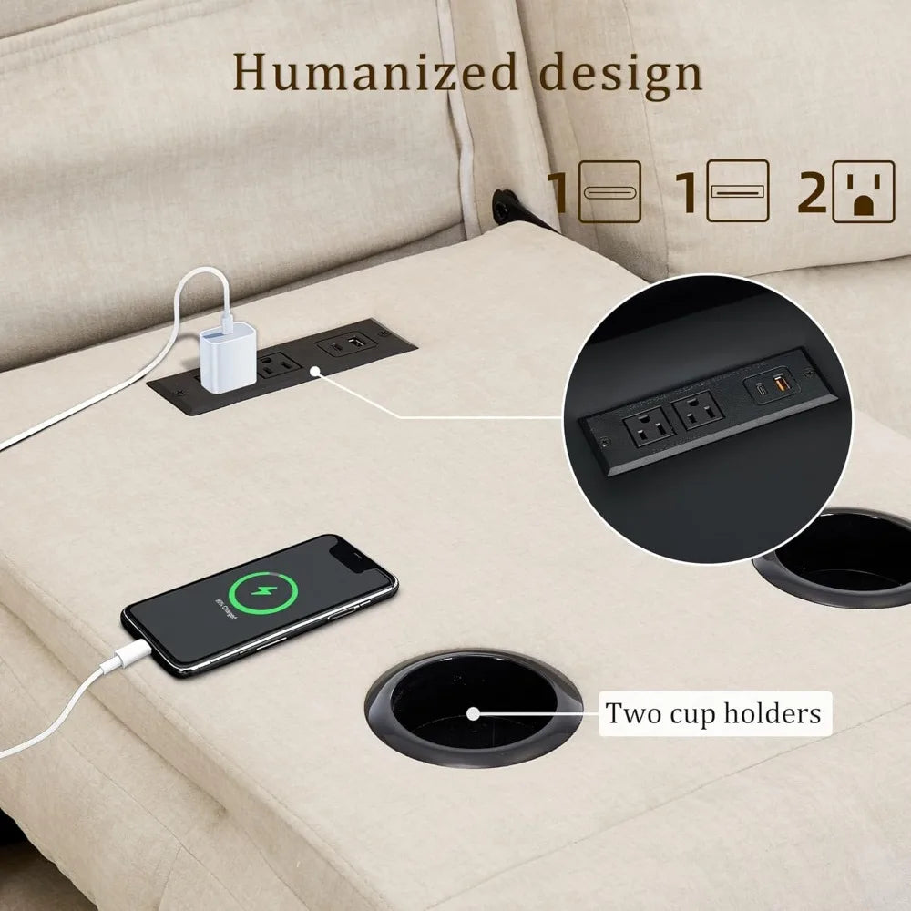 One of the standout elements of this sofa is the pull-down table integrated between the seats. It’s more than just a surface—it comes equipped with a US power outlet, USB ports, and a Type-C port. This thoughtful addition lets you charge smartphones, tablets, or other devices without leaving your seat, keeping everything within easy reach. The table also includes two cup holders, perfect for holding your coffee, tea, or cold drinks securely. A convenient storage pocket next to the charging station is ideal for stashing remotes, magazines, or other daily essentials, helping to keep your living area tidy.