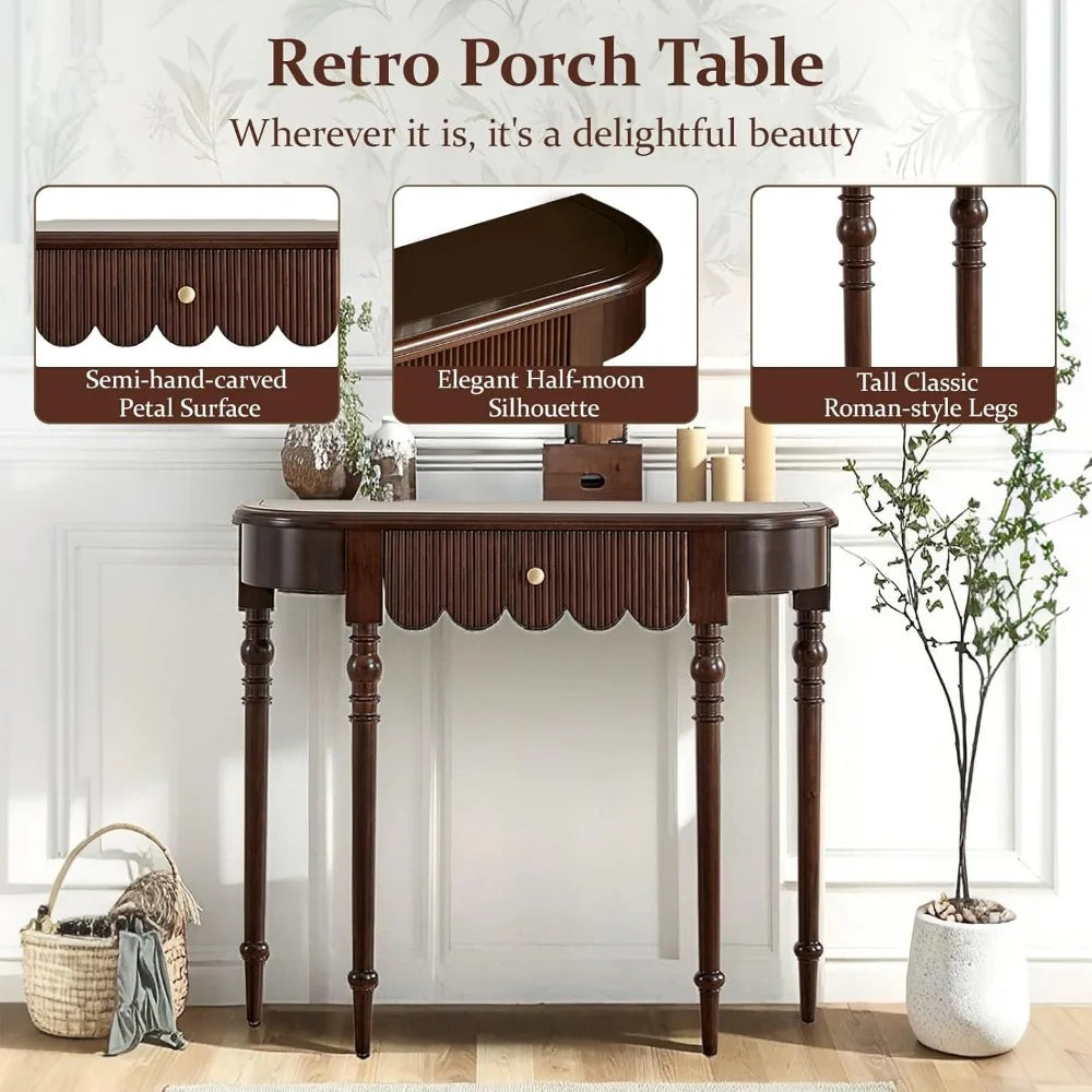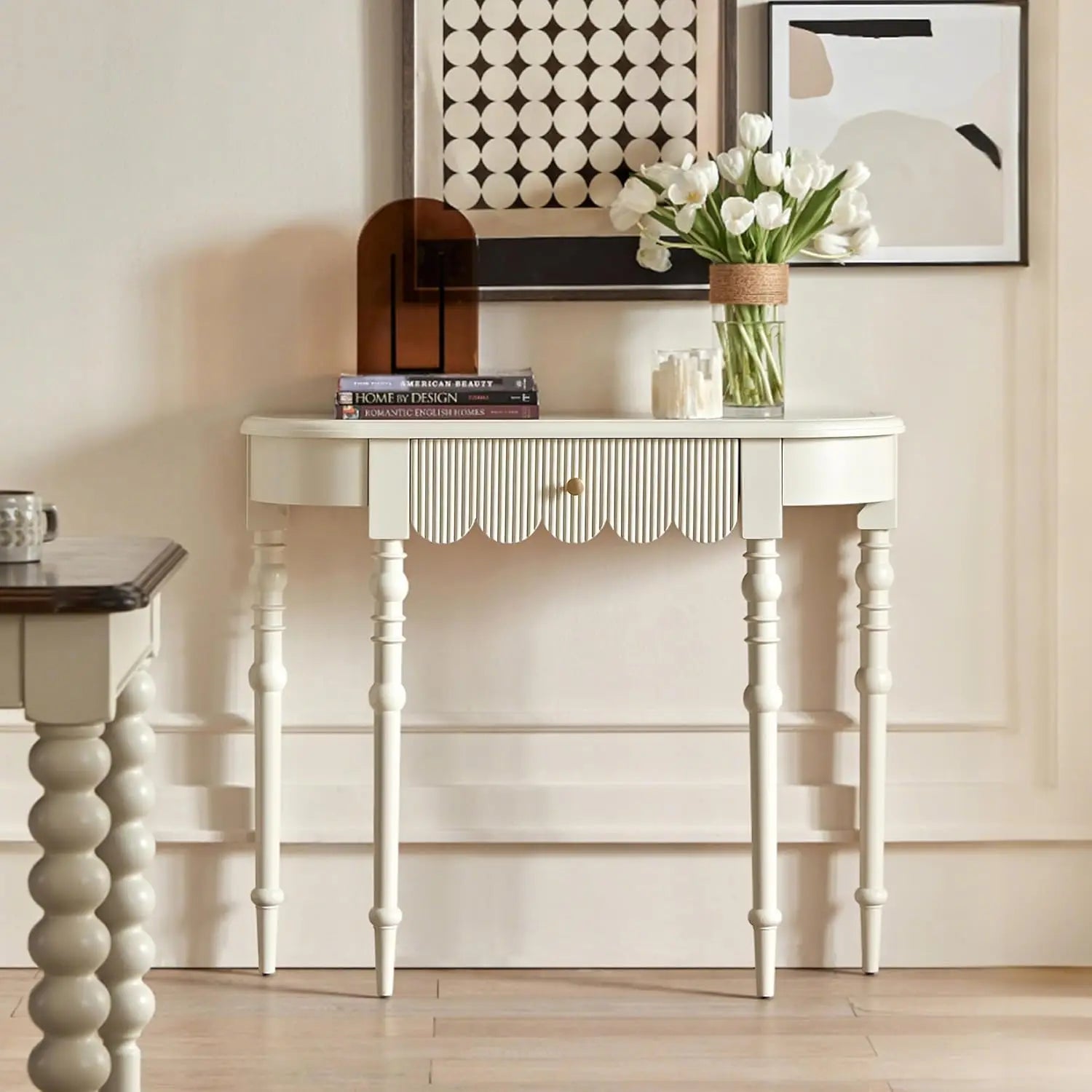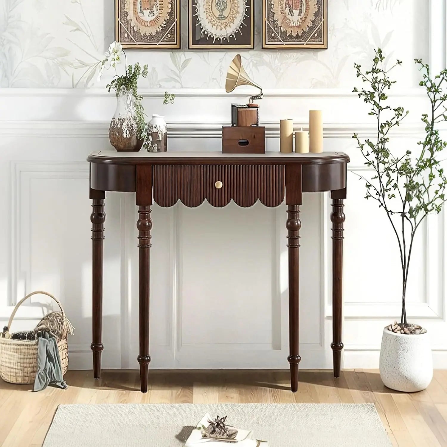 With its graceful scalloped edge and clean, straight legs, the design strikes a balance between classic charm and modern simplicity. Its narrow profile (39.37"D x 11.02"W x 33.46"H) fits perfectly in tighter spaces—whether tucked behind a sofa, lining a hallway, or anchoring an entryway—bringing warmth and style without taking up too much room.
