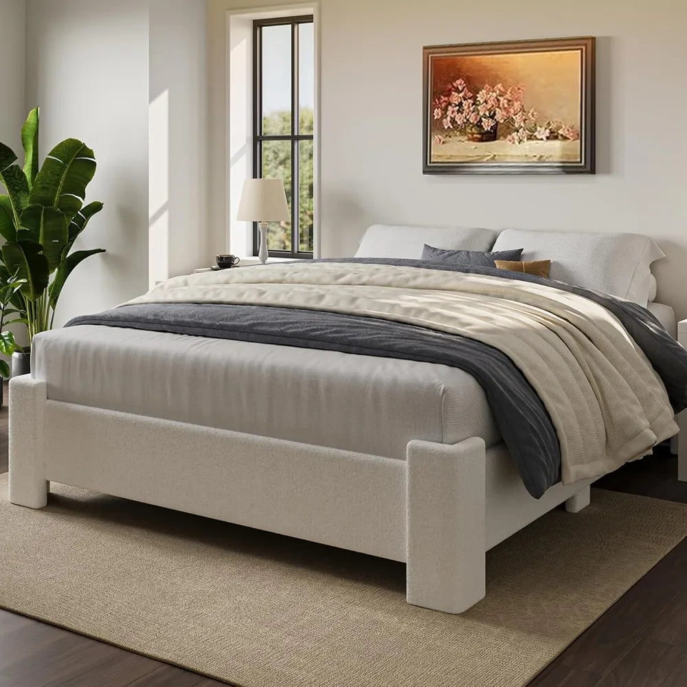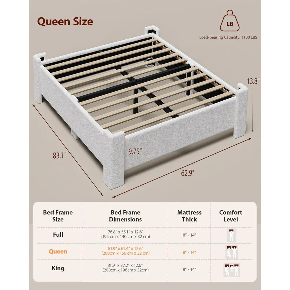 FurnitureZ l Sturdy Queen-Sized Boucle Platform Bed Frame for Bedroom