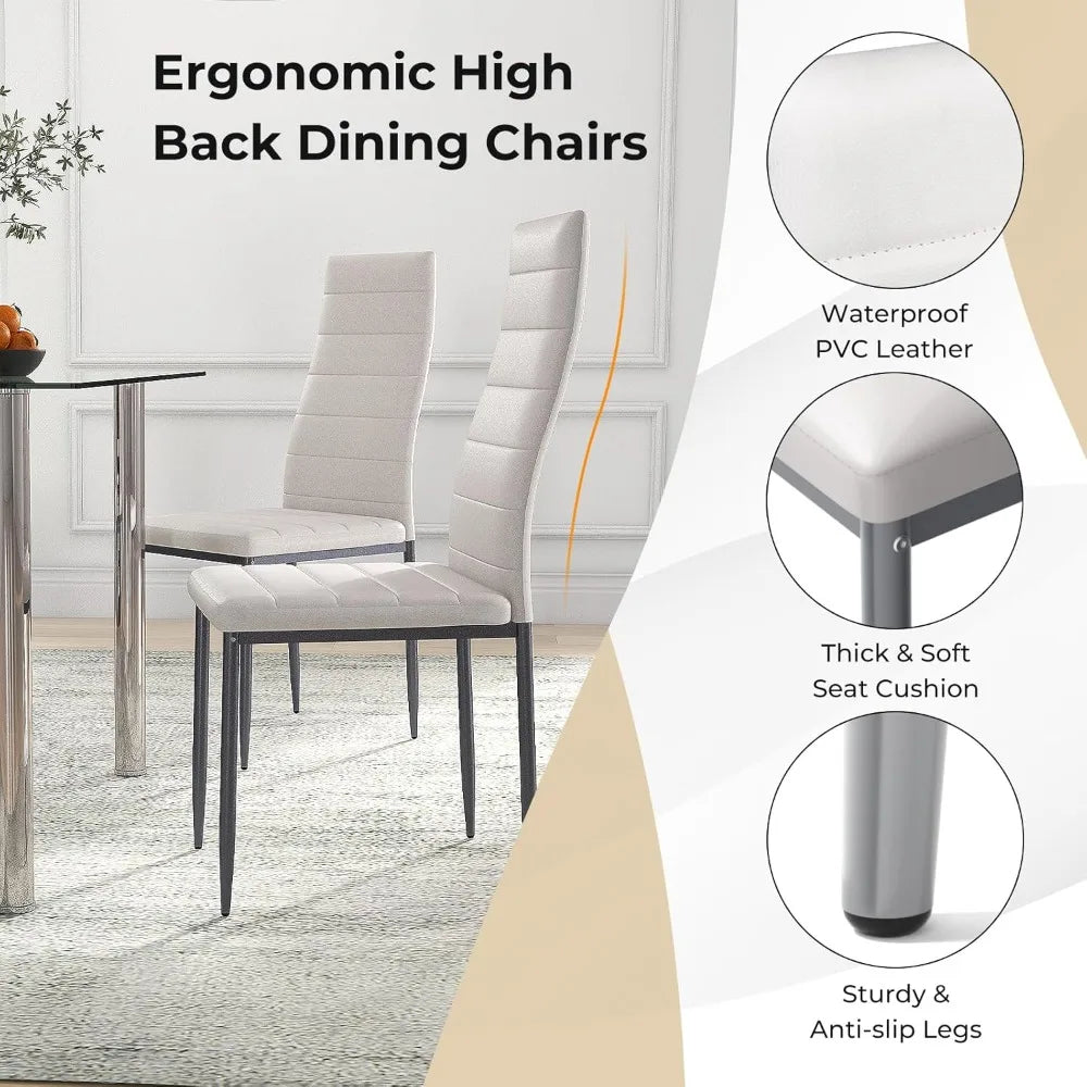 Built to stand the test of everyday life, the dining table features a robust stainless steel tube frame that resists rust and maintains its fresh look over time. The tempered glass top not only adds a touch of elegance but also provides a smooth, easy-to-clean surface that handles daily use with ease. Paired with four chairs cushioned in soft, durable PU leather, this set ensures comfort during meals without compromising on style.