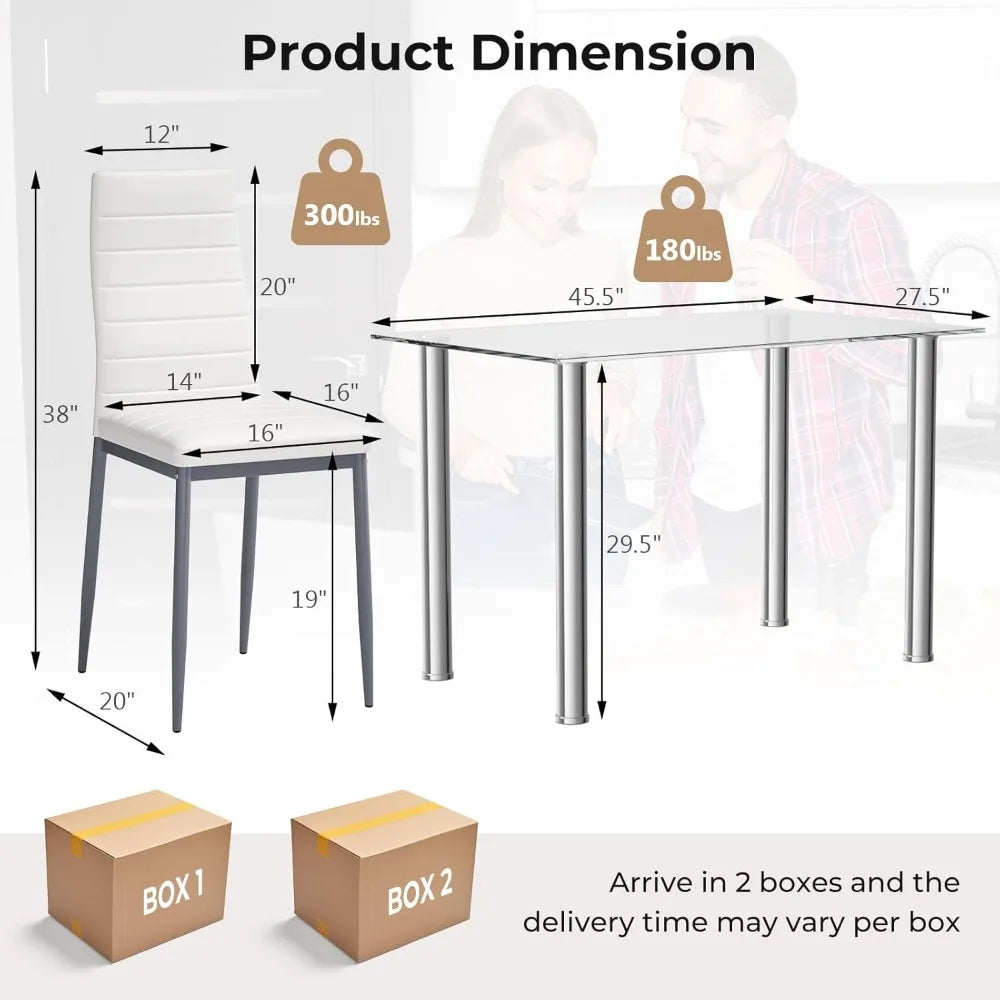 Meet the 5 PCS Dining Table Set: all the style and durability you want, at a price you'll appreciate. This modern dining set combines a sleek tempered glass tabletop with comfortable PVC leather chairs, offering a practical and stylish solution for your dining room, kitchen, or compact living space.