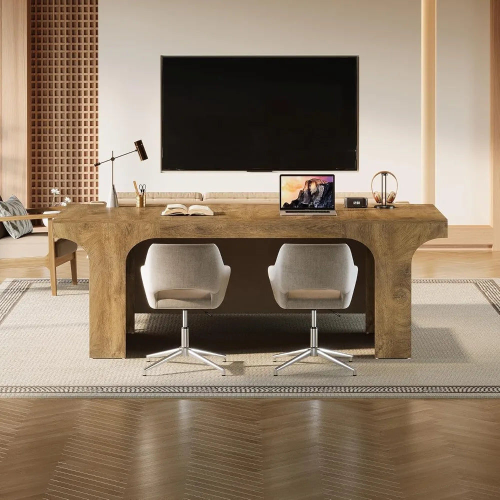 Meet the 70.87" Executive Office Desk: all the style and durability you want, at a price you'll appreciate. Designed to offer a spacious and comfortable workspace, this desk brings together smart construction, practical design, and a welcoming rustic charm that fits seamlessly into your home office or any room needing a reliable surface. Crafted from high-quality engineered wood with a laminated finish, this desk is built to withstand everyday use without warping, cracking, or splitting. The choice of MDF ensures a solid, sturdy frame that supports your laptop, monitor, books, and office essentials with ease, making your work area both functional and organized. The laminated surface is also easy to clean, helping you maintain a neat environment with minimal effort. With generous dimensions of 31.5" depth by 70.87" width, this desk provides ample room to spread out your work or study materials. Whether you need space for multiple devices or prefer having your favorite tools within arm’s reach, this wide desktop accommodates your needs without feeling cramped. Additionally, the 25.6" legroom height allows you to stretch freely, which means better comfort during long hours at your desk and less physical strain. What sets this desk apart is its unique arch-shaped leg design inspired by modern Scandinavian style. This slightly curved shape not only adds a touch of elegance but also creates a warm, inviting atmosphere that breaks away from the typical, sterile office look. It’s a perfect blend of rustic charm and contemporary design, making it a standout piece wherever you place it. Versatility is another strong suit of this desk. While it excels as an executive computer desk, it also adapts well as a writing table, craft desk, or even a stylish dining surface. Its rustic wood grain finish complements various decor styles, whether in a living room, bedroom, studio, or dedicated office space. This flexibility means you’re investing in a piece of furniture that grows with your lifestyle. Why You'll Love It: