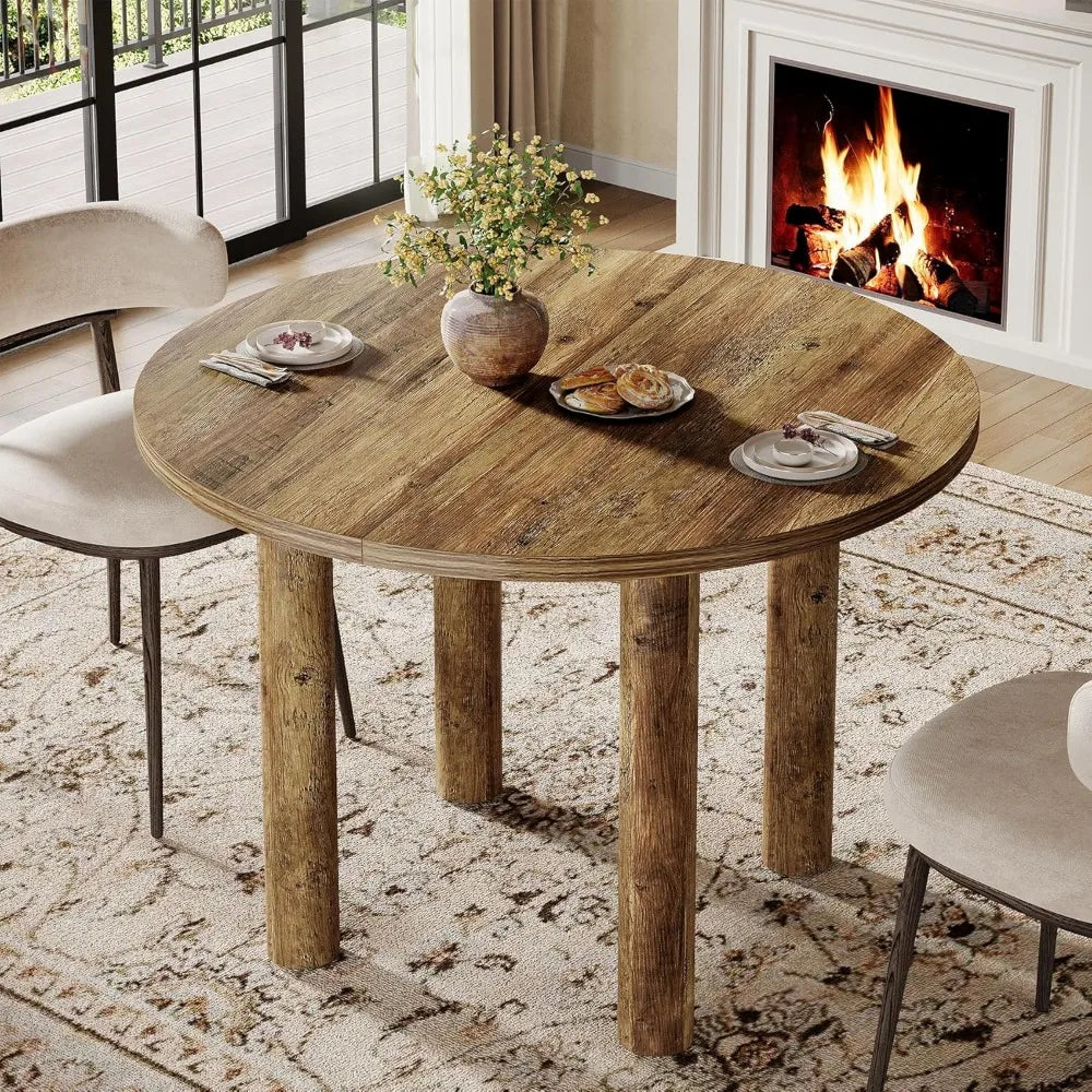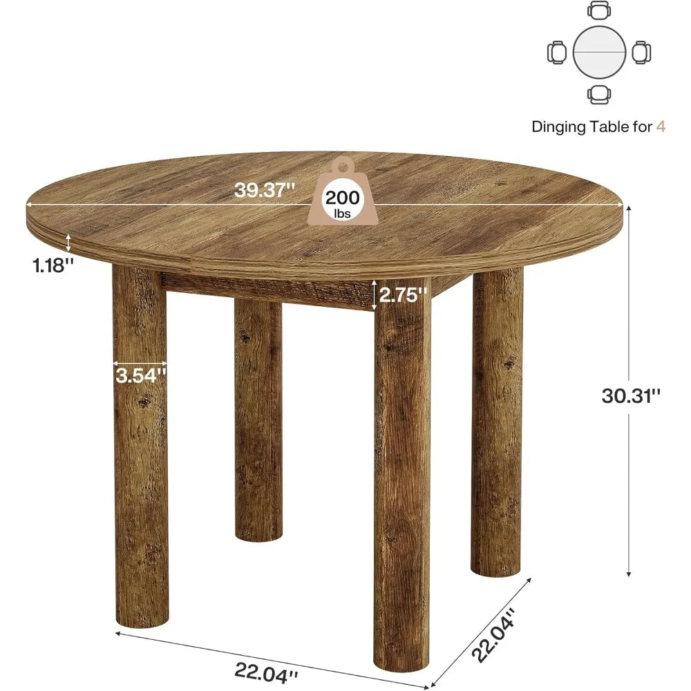 Meet the Round Dining Table for 2-4 People: all the style and durability you want, at a price you'll love. This 39-inch farmhouse kitchen table is designed to bring both function and charm to small spaces, making it an ideal choice for your dining room, kitchen, or even a cozy breakfast nook. Built with smart, affordable quality in mind, this table features a sturdy frame and tabletop crafted from high-quality engineered wood. The 1.18" thickened tabletop is not only waterproof but also scratch-resistant and easy to clean, ensuring it stays looking great through everyday use. The rich brown finish highlights the natural warmth of the wood and pairs beautifully with the unique cylindrical legs, which provide reliable stability and support for up to 220 pounds. This thoughtful construction means you get a durable piece that fits seamlessly into your home without compromising on style. Perfectly sized for 2 to 4 people, the 39.37" diameter offers ample dining space and comfortable legroom. Whether you're enjoying a quiet dinner for two or hosting a small gathering, the round shape encourages conversation and connection, making every meal feel special. Its versatile design also allows it to serve multiple purposes—use it as a dining table, kitchen table, casual coffee table, or even a workspace. This flexibility makes it an excellent solution for apartments, starter homes, or any room where space is at a premium. Why You'll Love It: