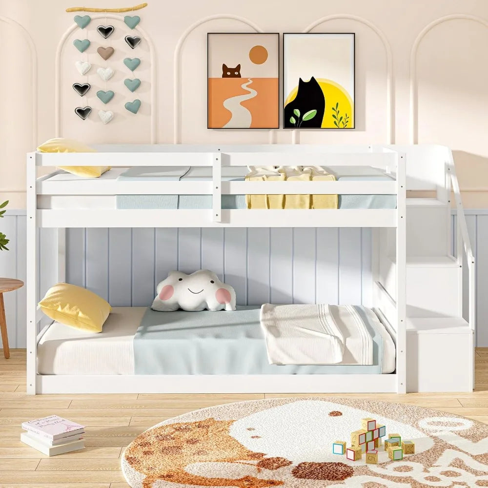 FurnitureZ l Twin Over Twin Bunk Bed with Stairs for Bedroom, Kids