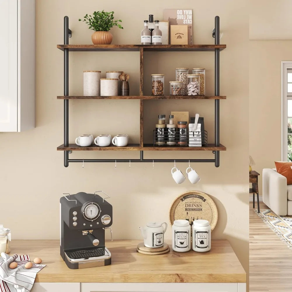The three-tier open shelving provides ample space to organize your essentials—whether that’s coffee supplies, wine bottles, decorative items, or cookbooks. A smart partition in the middle of the shelves adds stability and ensures the shelf can hold up to 20 pounds per tier safely. Plus, it comes with eight S-shaped hooks that attach to the bottom metal tube, giving you a convenient spot to hang mugs, keys, utensils, or small kitchen tools, keeping your counters clutter-free.