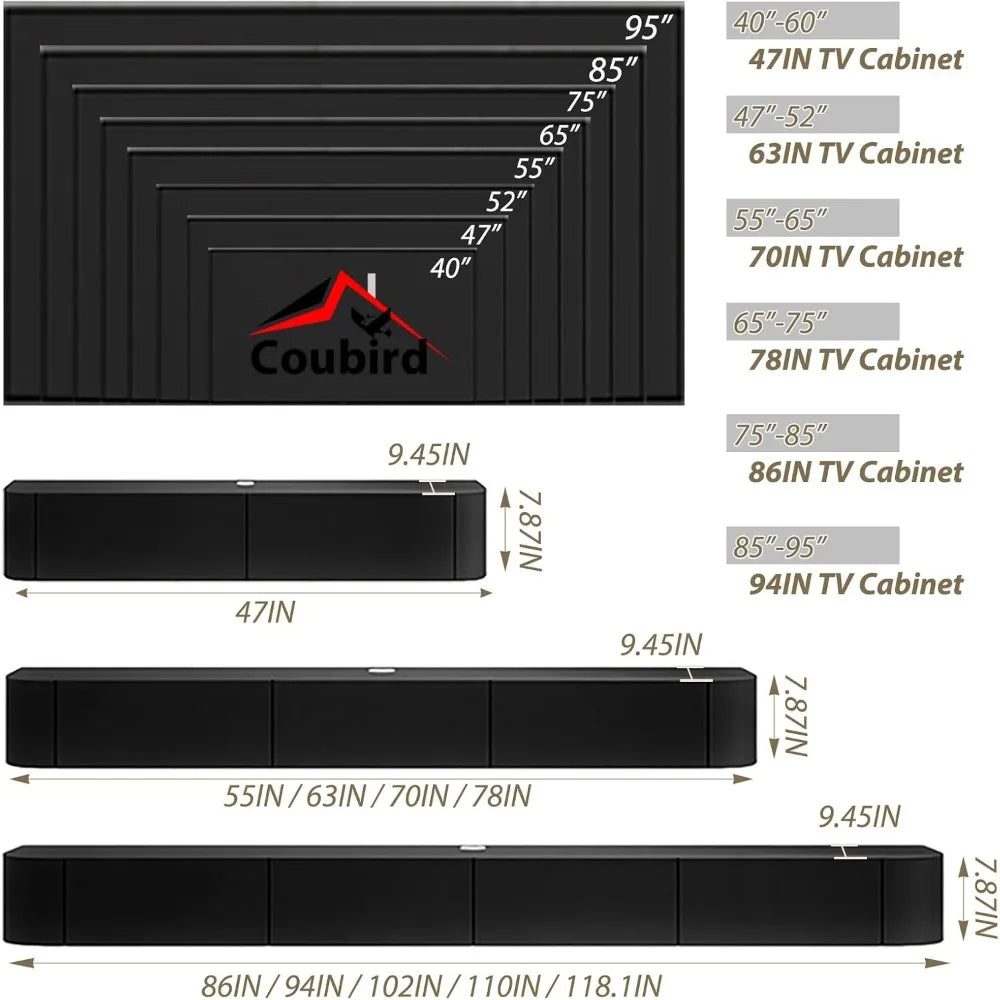 The smart layout includes integrated cable management features like cord channels and rear cutouts that keep wires neat and out of sight, so your entertainment area looks tidy and well-organized. Available in 10 sizes from 47" to 118", this TV stand fits most TVs between 40" and 100" wide, making it a versatile choice for various room sizes and setups.